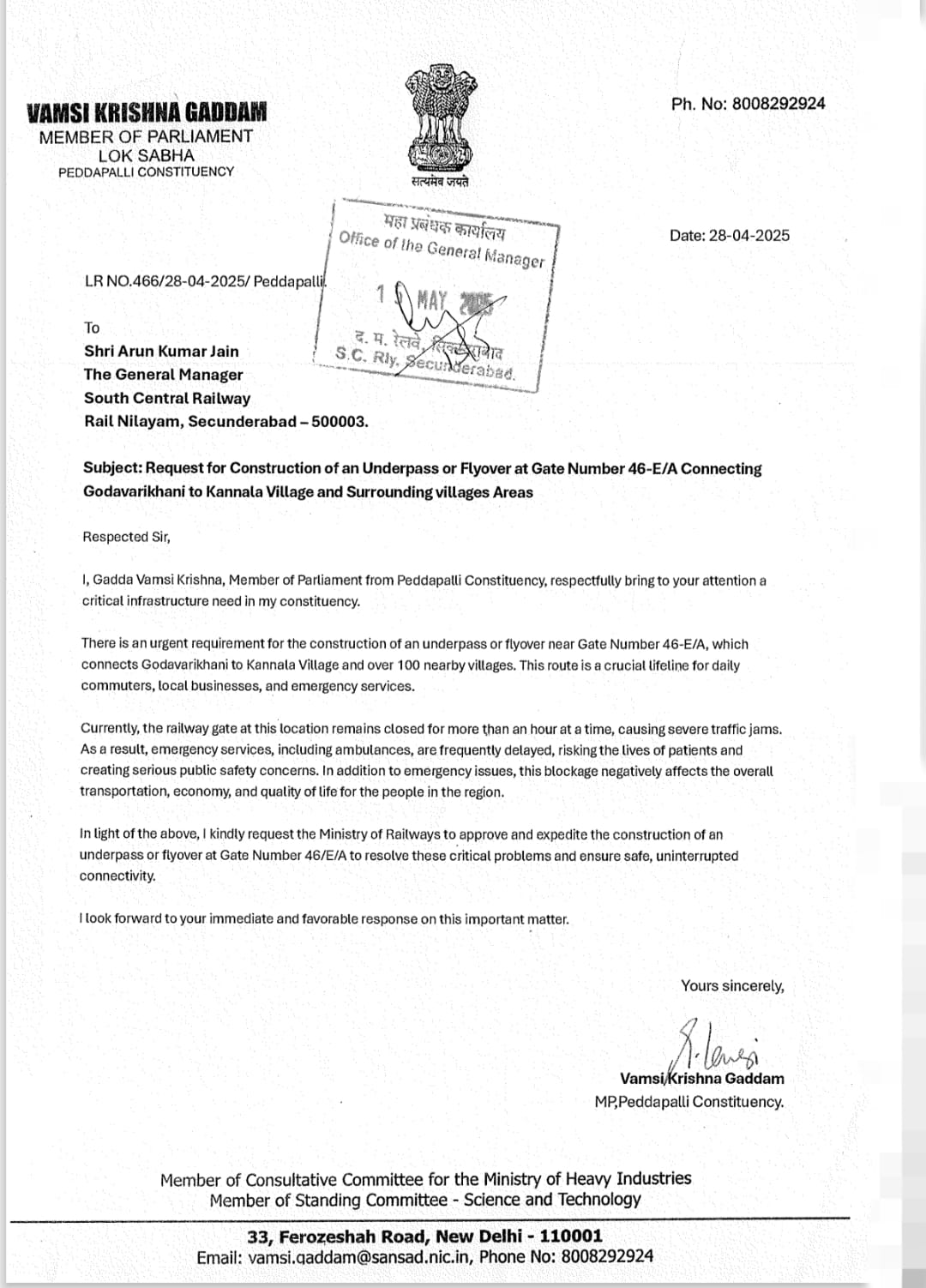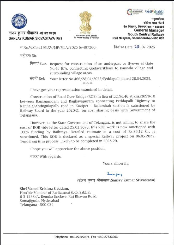పల్లవి, వెబ్ డెస్క్ : పెద్దపల్లి పార్లమెంట్ నియోజకవర్గపరిధిలో గోదావరిఖని నుంచి కన్నాల గ్రామం మరియు చుట్టుపక్కల 100 కంటే ఎక్కువ గ్రామాలకు కలపే రైల్వే గేట్ నంబర్ 46-E/A వద్ద ప్రజలు, ప్రయాణికులు పడుతున్న ఇబ్బందులను రవాణా అంతరాయాలు, అత్యవసర సేవలకు ఆటంకాలు తలెత్తుతున్నందున వాటిని నివారించేందుకు అండర్పాస్ లేదా ఫ్లైఓవర్ నిర్మించాలని పెద్దపల్లి ఎంపీ గడ్డం వంశీకృష్ణ రైల్వే శాఖకు లేఖ రాశారు.ఈ లేఖ పై స్పందించిన దక్షిణ మధ్య రైల్వే జనరల్ మేనేజర్ శ్రీ సంజయ్ కుమార్ శ్రీవాస్తవ గారు ఆర్.ఒ.బీ. (రోడ్ ఓవర్ బ్రిడ్జ్) నిర్మాణానికి ఇప్పటికే 2020-21 సంవత్సరంలోనే రైల్వే బోర్డు అనుమతి మంజూరు చేసినట్లు తెలిపారు.