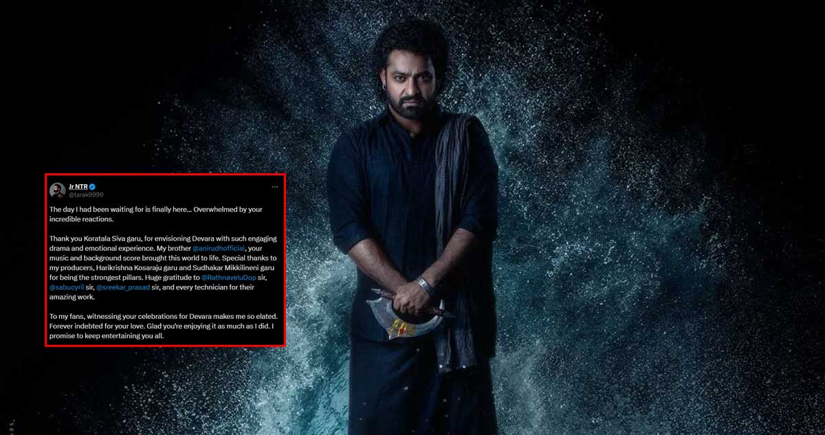 దేవర సినిమాకు ప్రేక్షకులనుంచి వస్తోన్న రెస్పాన్స్ ను ఉద్దేశించి నటుడు హీరో ఎన్టీఆర్ తాజాగా సోషల్ మీడియాలో ఓ పోస్ట్ పెట్టారు.