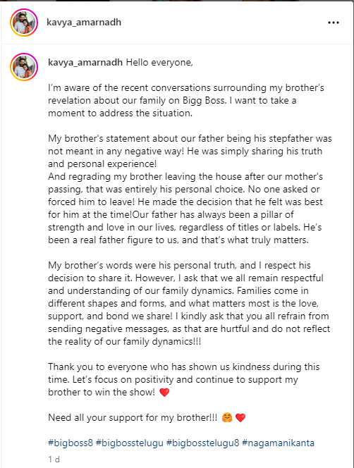 మా నాన్న గురించి అన్నయ్య స్టెప్ ఫాదర్ అని చెప్పారు. అది అతను నెగిటివ్ వేలో చెప్పలేదు, కేవలం అతని విషయాలను చెప్పుకొచ్చారు.. అలాగే మా అమ్మ తదనంతరం అయన ఇంటి నుంచి వెళ్లిపోయారు.. అతన్ని ఎవరు ఇల్లు వదిలి వెళ్ళమని చెప్పలేదు, అది పూర్తిగా అయన సొంత నిర్ణయమేనని కావ్య చెప్పింది. తన తండ్రి అన్నయ్యకు ఎప్పుడూ సపోర్ట్ గానే నిలిచారని తెలిపింది. తమ ఇద్దరి జీవితాలకు కావాల్సినంత ప్రేమను అందించారంది కావ్య. అన్నయ్య మాట్లాడిన మాటలు పూర్తిగా అయన వ్యక్తిగతమని కావ్య క్లారిటీ ఇచ్చింది. అయన డెసిషన్స్ కు తాము రెస్పెక్ట్ ఇస్తామంది. కుటుంబాలు వివిధ రకాలుగా ఉంటాయి, అవి ఎలా ఫామ్ అయినా కుటుంబమే.. దయచేసి తన అన్నయ్య మాటలపై నెగిటివ్ కామెంట్స్ చేయవద్దని… తమ ఫ్యామిలీ ఆ మాటలకు ఇబ్బంది పడుతుందని తెలిపింది. దయచేసి తన అన్నయ్యకు సపోర్ట్ చేయండంటూ కావ్య తన పోస్టులో చెప్పుకొచ్చింది.